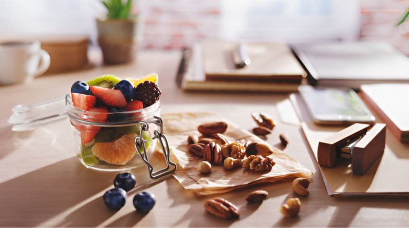 Stock your workspace and home with healthy options. Keep nuts in your desk drawer, store pre-cut vegetables in the fridge, and prepare some batch-cooked snacks on Sunday.